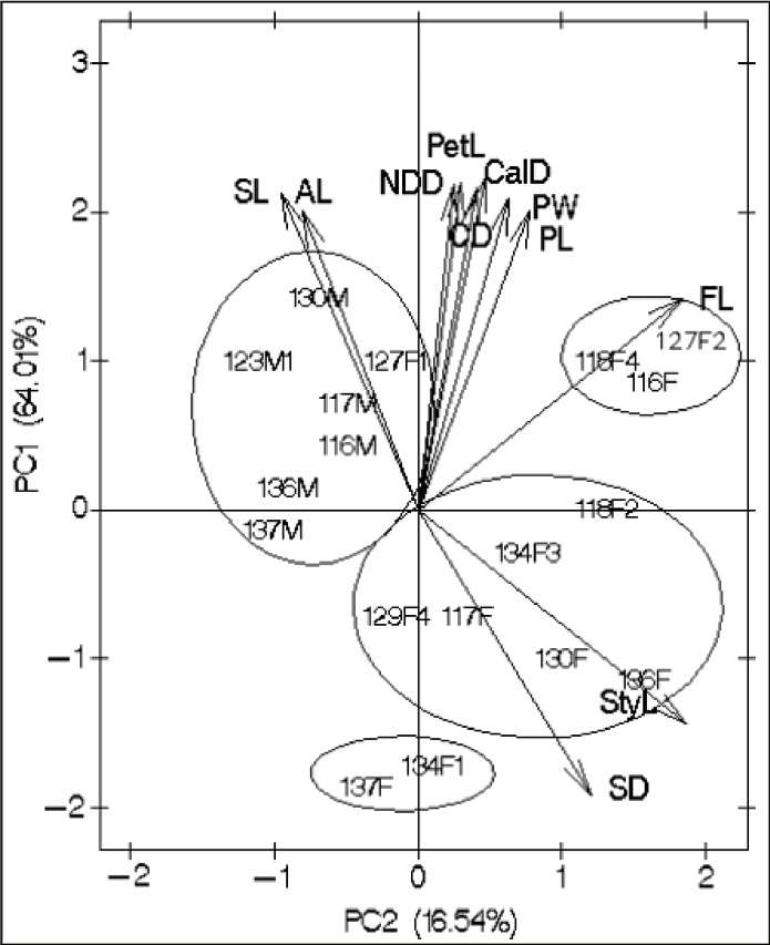Statistical analysis showed that the first two principal components contributed with 80.55% of the variability in the data set (Table 1). The remaining generated PCs (PC3 to PC11) progressively produced smaller eigenvalues and did not significantly explain the variability of the data. Therefore, only the first two PCs were used for extra studies. Analyzing the eigenvectors corresponding to PC1, the variables that showed greater discriminatory power were 0.34 for the petals length, 0.33 for the corolla, calyx and nectar disc diameter. In PC2, the main eigenvectors were 0.55 for stylus length and 0.54 for flower length (Table 1).