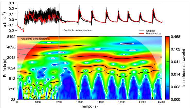 Figura 5 – Transformada de wavelet de Morlet para a série temporal de u no nível 0,2 m. A linha preta na seção superior mostra a série temporal e a linha vermelha a série reconstruída pela transformada de wavelet. Na seção inferior, a região interna as áreas laterais com transparência branca representam o cone de influência onde a confiabilidade é de 95%. As regiões vermelhas representam as frequências mais relevantes enquanto as azuis as menos relevantes. Foram realizadas 1000 simulações para a reconstrução da série temporal e posterior geração da figura