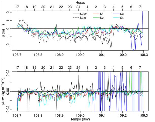 A Figura 5 apresenta as características dinâmicas para a noite em questão. O painel superior mostra que tanto a componente zonal do vento ambiente, quanto à do escoamento próximo à superfície apresentavam a direção de descida da encosta em grande parte do período observado. Pode-se notar que a magnitude de u a 3 m é maior que a do vento ambiente no início da noite, principalmente na faixa entre 19 e 21 h. Para a faixa entre às 17 h e a meia-noite, a velocidade média é de 0,9 m/s. As estações também mostram que o escoamento adjacente à superfície é mais forte que o sinótico, o que comprova que a drenagem intensifica o escoamento próximo ao chão (AMANATIDIS et al., 1992). Além do mais, observando novamente o painel superior da Figura 4, nota-se que a faixa em que a velocidade do escoamento de drenagem é à velocidade do escoamento sinótico corresponde ao período em que S1 está mais fria que S3m. Como já visto, quando isso ocorre o escoamento de drenagem se intensifica (MAHRT et al., 2001). O painel inferior apresenta um comportamento diferente do fluxo de momentum. Para a faixa entre às 17 e a 1 h, este é negativo para todos os níveis próximos ao chão. Contudo, S30m apresenta regiões em que o fluxo de momentum é positivo, ou seja, o ponto de velocidade máxima do escoamento está acima dos 3 m.