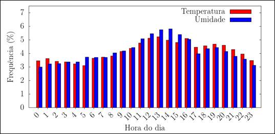 Figura 4 – Frequência de disponibilidade, em função do horário, dos dados de temperatura e umidade relativa após a remoção dos dados