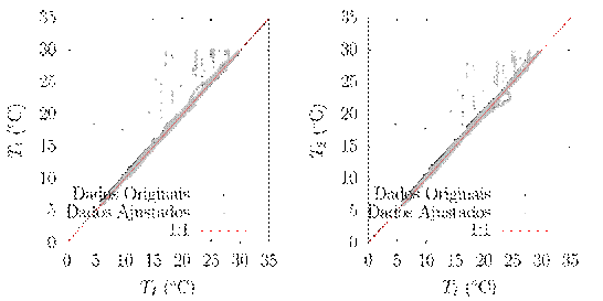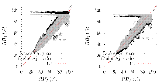 Figura 5 – Correlação entre as temperaturas e umidades relativas a serem corrigidas e as de referência antes (em preto) e depois (em cinza) das correções