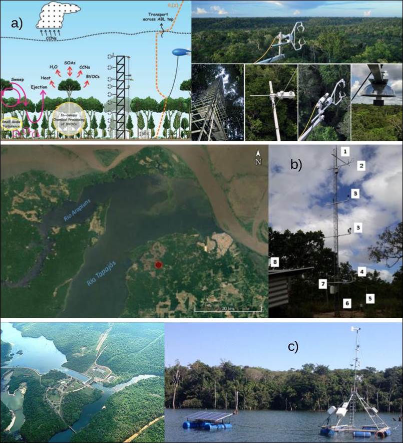 A savana, uma das poucas áreas naturais deste tipo de vegetação na amazônica, localiza-se no município de Santarém à margem leste do rio Tapajós. Em maio de 2017 foi instalada um torre triangular com 14m de comprimento, equivalente a duas vezes a altura do dossel e, desde setembro de 2018, medidas continuas vem sendo realizadas neste sítio (Figura 1, COSTA, 2019). Os dados do Lago foram coletados no reservatório da hidrelétrica Curuá-Una, distante cerca de 70Km da cidade de Santarém, medidos por um sistema de covariância de vórtices turbulentos instalado em uma boia micrometeorológica, que operou de junho de 2015 a julho de 2016 (VALE et al., 2016b). As medidas de temperatura sônica e componentes da velocidade do vento utilizadas neste trabalho foram feitas por anemômetros sônicos tridimensionais (CSAT3,Campbell Scientific; Logan, UT, EUA), sendo que a taxa de amostragem e altura das medições em cada sítio estão sumarizados na tabela 1.