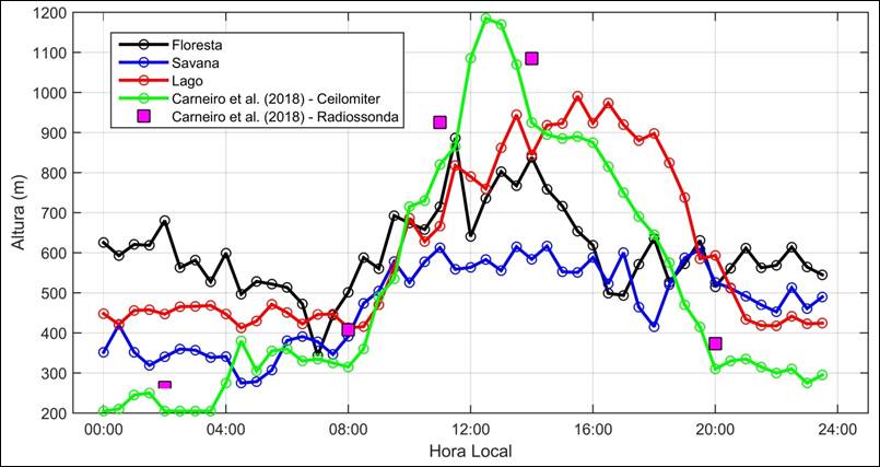 Figura 2 – Ciclo diário da altura da camada limite () para diferentes tipos de superfície