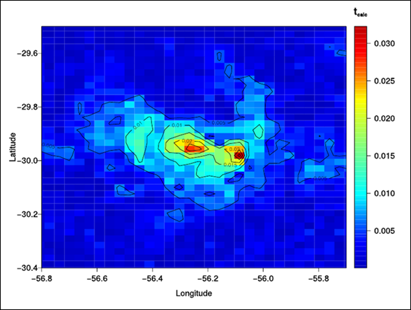 A Figura 3 mostra a influência da presença do parque eólico sobre o campo de temperatura, na região do menor domínio da grade do WRF. O teste t de Student (ou simplesmente teste t) foi realizado utilizando como valor de referência a temperatura média anual das simulações sem o parque eólico, e a outra amostra é a temperatura média anual das simulações com o parque eólico. É possível observar que as amostras possuem diferença em regiões distintas, entretanto, as maiores diferenças estão localizadas na região do parque e a jusante, na direção média da esteira resultante da presença das turbinas eólicas. É importante destacar, que o teste t não indica se a amostra foi subestimada ou superestimada, apenas se a diferença entre as amostras é significativa. Como discutido anteriormente, nas temperaturas à 2 m as diferenças foram pequenas, e geralmente nos casos com o parque eólico a temperatura foi menor que sem parque eólico.