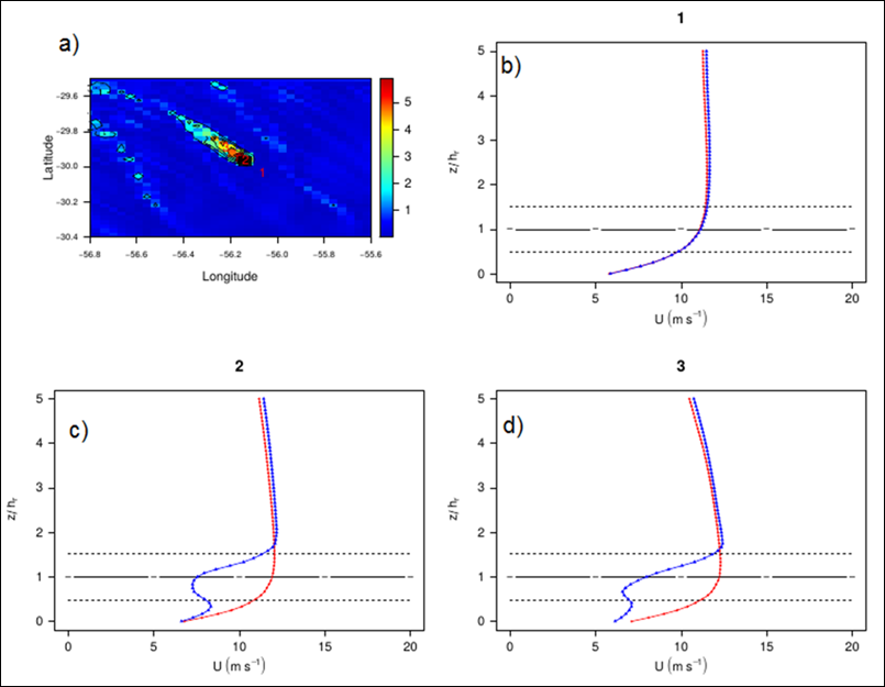 Figura 4 – Diferença para a velocidade do vento médio, a 10 m, entre as configurações WRF (linha vermelha, nas Figuras 4b-4d) e WRFWF (linha azul, nas Figuras 4b-4d) (Figura 4a), às 22h do dia 09 de novembro de 2008. Perfis verticais do vento médio no ponto 1 da Figura 4a (Figura 4b). Perfis verticais do vento médio no ponto 2 indicado na Figura 4ª (Figura 4c). Perfis verticais do vento médio no ponto 3 indicado na Figura 4a (Figura 4d)