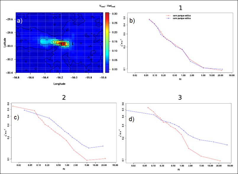 A influência dos aerogeradores na estrutura vertical da turbulência do escoamento pode ser verificada a partir da análise da turbulência do escoamento em função da estabilidade do escoamento. Para determinar a influência da turbulência gerada pelas turbinas eólicas sobre o escoamento na camada superficial é definido um número de Richardson entre as variáveis do escoamento na camada superficial e as variáveis do escoamento na altura do rotor dos aerogeradores (RiCS-rot):