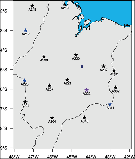Figura 1 – Mapa com a distribuição espacial das estações meteorológicas automáticas empregadas no estudo. As estações são identificadas com a marcação de uma estrela e tem ao seu lado o código INMET associado. As estrelas indicadas em azul mostram estações com mais de 20% de falha na aquisição de dados horários para o período chuvoso, enquanto em roxo para ambos os períodos, o ponto marcado mostra a localização da UTE