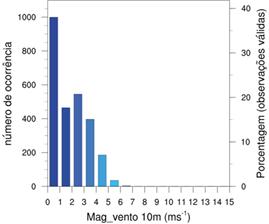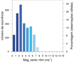 Com as parametrizações MYNN e YSU, foi mostrado valores de V10m de até 10 ms -1. Diferente desse resultado, foi constatado pelas duas parametrizações quando configurados com a parametrização cúmulus, mostrando valores ≤ 8ms-1 . No período chuvoso (figura 4), o modelo subestimou os valores de V10m ≤ 1ms-1. Sem a parametrização cúmulus, a parametrização YSU mostrou maior número de ocorrência de V10m do que quando configurado com a parametrização cúmulus.