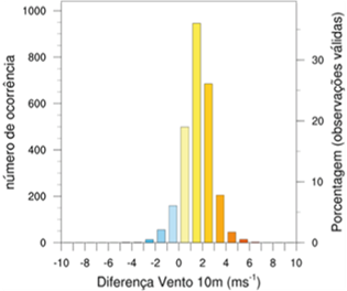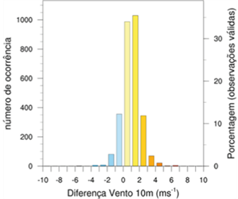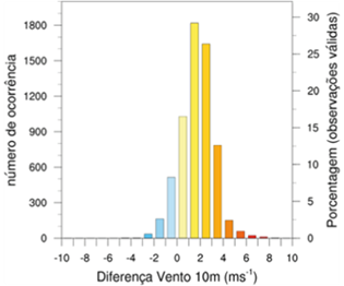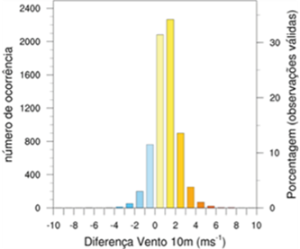 Utilizando-se os valores de V10m observados e modelados, foi calculada a diferença entre esses dois valores para cada observação, ou seja o erro instantâneo dado pela equação 1. A figura 5 mostra o histograma da diferença entre os valores observados e simulados de V10m.