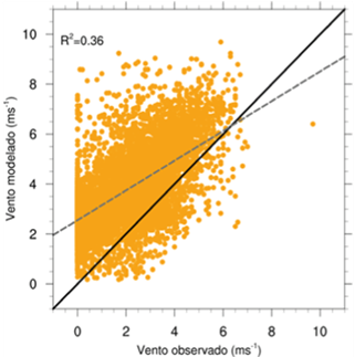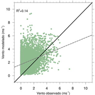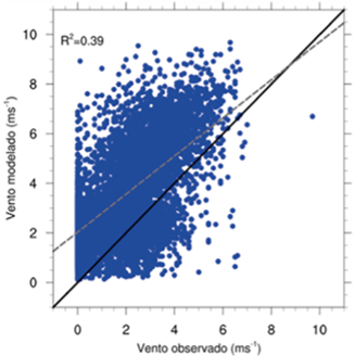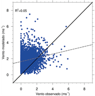 Os resultados apresentado pela figura 3, mostraram que o modelo simulou valores de magnitute do vento acima de 7 ms-1 e subestimaram os menores valores de V10m, no período seco.
