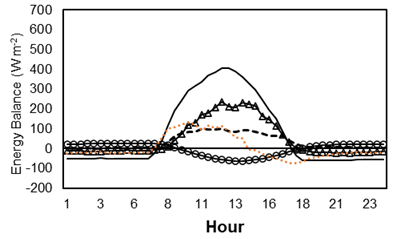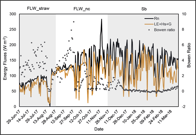 Sun et al. (2018) state that the energy balance varies as a function of ground cover and time of year. The flux partition is significantly affected by the presence of photosynthetically active vegetation under the ground, while dead vegetation usually has a high albedo value which causes a decrease in Rn values.