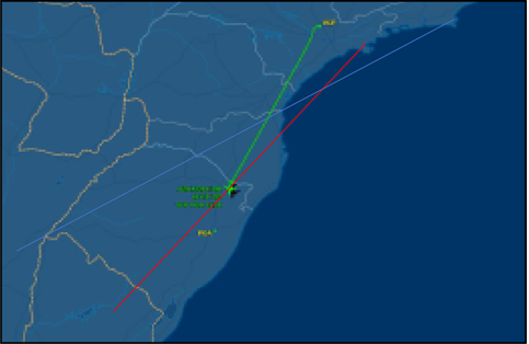 Figure 1 – Example of flights between airports of Campinas-Porto Alegre (green), Cordoba-Rio de Janeiro (light blue), Buenos Aires-São Paulo (red)