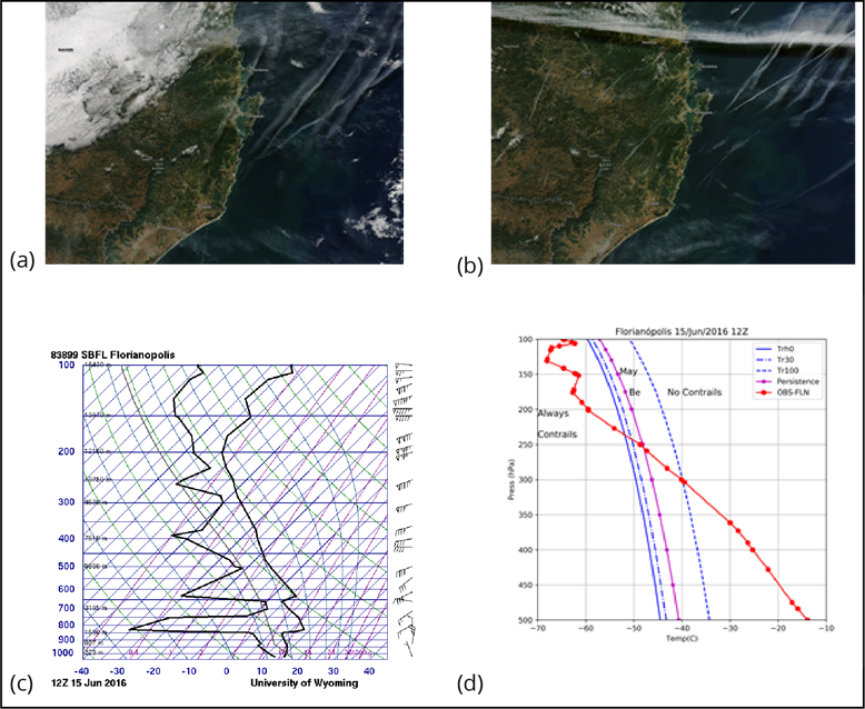 Figure 02 shows results for the observed contrail occurred on 15 June 2016 as observed at around 13:10 UTC by the Terra (Fig. 2a) and around 17:30 UTC by the Aqua (Fig. 2b) satellites. These images show several contrail lines over the continent and over the sea. The figures show also that several of these contrails evolved to broader cirrus contrails. In some locations these cirrus contrails reached about 13 km of width. Their locations over the sea are due to strong southwesterly winds at the 250 hPa layer (Fig. 2c). The Appleman diagram shows that at this layer, there were conditions for contrails formation as the temperatures above 250 hPa were colder than -50 ºC and shows conditions for persistent contrails (Fig. 2d).