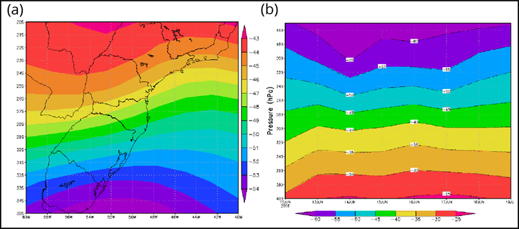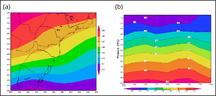 Figure 3 – (a) Air temperature (ºC) at 250 hPa on 15 June 2016, (b) time series at 28oS and 49oW, from NCEP Reanalysis data