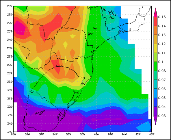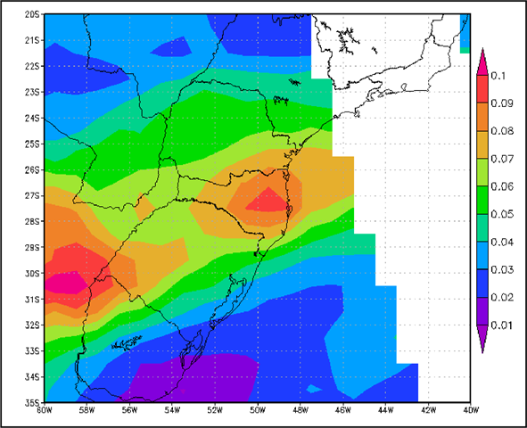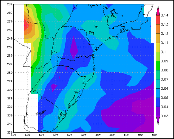Figure 07 shows the presence of higher moisture over the state of Santa Catarina and over the sea. At this region, the mixing ratio was higher than 0.12 g/kg and therefore was an important parameter for the contrails formation and persistence.