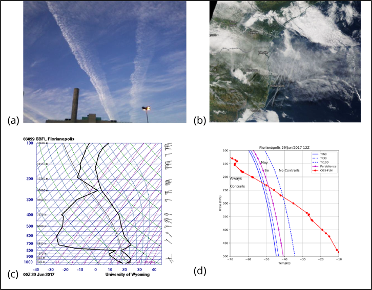 Figure 5 - (a) sky photography of a contrail in the city of Florianópolis (source RRSilva), (b) Terra satellite image, (c) Skew-T profile and (d) Appleman diagram for 29 June of 2017. Tr00, Tr30, and Tr100 are thresholds for Relative Humidity of 00%, 30% and 100%, respectively