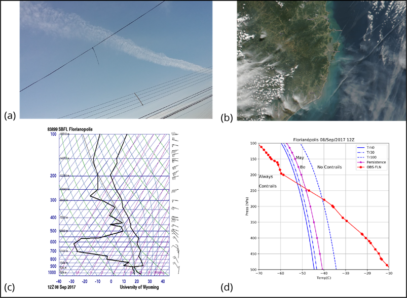Figure 8 – (a) Sky photography of a contrail recorded at Florianópolis (source V. Lins), (b) Suomi satellite image, (c) Skew-T profile and (d) Appleman diagram for 08 September 2017. Tr00, Tr30, and Tr100 are thresholds for Relative Humidity of 00%, 30% and 100%, respectively
