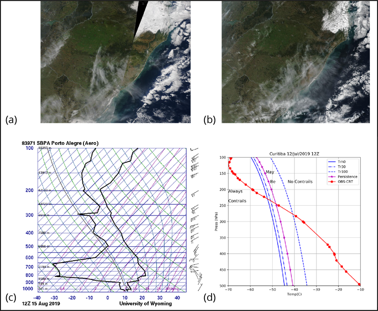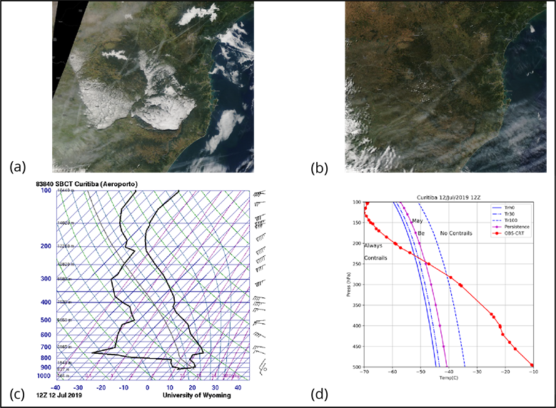 The Terra satellite image for 12 July 2019 shows contrails located over the state of Paraná, close to the city of Curitiba (Fig. 11a). Further in the afternoon, the Aqua satellite image shows formation of cirrus contrail that extends from the state of Santa Catarina and gained physical characteristics quite different from the initial ones (Fig. 11b). At the time when contrails were formed near the city of Curitiba, the skew-T diagram shows a profile with a very dry atmosphere, but shows a high relative humidity near 12 km height reaching moisture of about 53% (Fig. 11c). The Appleman diagram shows again a quite low temperature reaching -50 ºC above the layer of 250 hPa (Fig. 11d). As these contrails are transported to different locations from the westerly winds, they can change their initial characteristics according to the environmental conditions. At this dispersion phase, parameters that can modify their structure include wind shear and atmospheric turbulence (PAOLI et al., 2014), and radiation heating exchange (UNTERSTRASSER and GIERENS 2010).