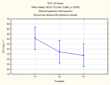 Table 2. Values of means and standard deviation for Dissolved Oxygen (mg L-1) and pH for the different treatments in the 45 days of the experiment.