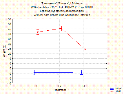 Table 8. Values of average weight (g), standard length (SL) and total length (TL), in centimeters (cm) at the beginning and at the end, for the different treatments.
