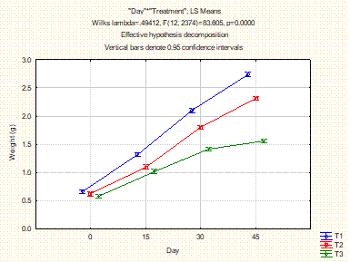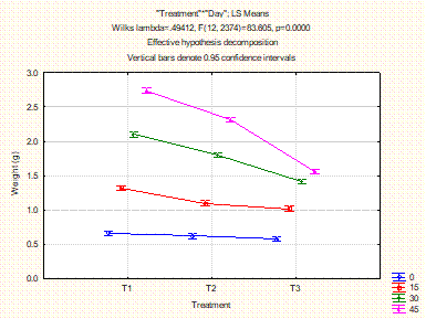 Figure 22. Graph representing fish weights (g) in biweekly biometrics of each treatment.