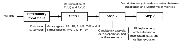 As the informationareregistered manually in Sisagua, some inconsistencies may occur in this database. In this sense, reference values for analytical limits of detection and quantification (Step 1) had to be established prior to the solution of consistency problems. Subsequently, steps to fill, replace, and reclassify inconsistent data were proposed (Step 2) and, finally, descriptive analyses were carried out (Step 3). A general scheme of the data analysisprocedureis shown in Figure 1.