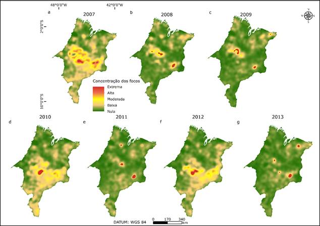 Nas figuras 5 e 6 são apresentados os mapas de kernel, gerados a partir da interpolação dos focos de calor, em cada ano, analisado com o propósito de se estimar a densidade destes eventos na área de estudo, escalonada em cinco classes: nula, baixa, moderada, alta e extrema, onde manchas em tons mais avermelhados expressam maior densidade, enquanto manchas em tons mais verdes denotam densidade mais baixa. Ao analisar os mapas, percebe-se que as áreas de maior densidade de focos marcam a região central do estado, especialmente em 2007, no qual a densidade considerada como extrema pontuou nas mesorregiões centro, leste e oeste maranhense. Entretanto, mesmo com destaque para a região central do estado, verifica-se que houve uma diluição da concentração de focos, resultando no aumento das áreas com manchas de densidade moderada, baixa e, principalmente, nula (Figuras 5 e 6).