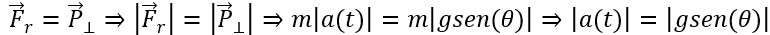 Partindo da figura percebe-se que força resultante é a componente da força peso. Nota-se ainda que a resultante é uma força restauradora, ou seja, aponta para a posição de equilíbrio. Nesse caso, tem-se um movimento bi-dimensional, entretanto, esse movimento pode ser completamente descrito pela variável , o ângulo entre a posição do fio e a vertical. Dessa forma, tem-se um movimento que depende de apenas uma variável. Por questão de simplicidade considera-se θ como sendo positivo quando localizado a direita da posição de equilíbrio (conforme mostrado na figura 10), e negativo quando o pêndulo se encontrar no lado esquerdo da posição de equilíbrio.