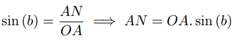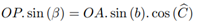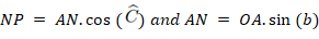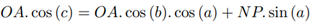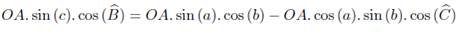 Consider a straight line perpendicular to the OBC plane that passes through vertex A of the spherical triangle, P is the point of intersection of this line with the OBC plane. The line segment AP is perpendicular to the OBC plane. Using a similar process, starting from P, the PM and PN line segments are obtained, perpendicular to the OB and OC line segments, respectively. Thus, the Euclidean triangles APN, APM, ONP, OMP and OPA are right triangles. Therefore, it follows that