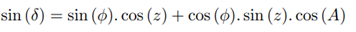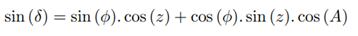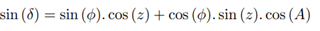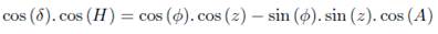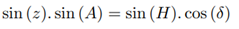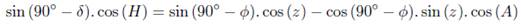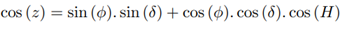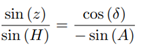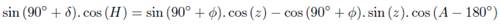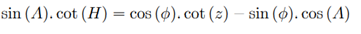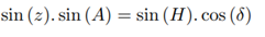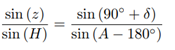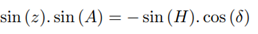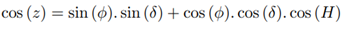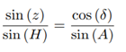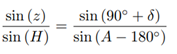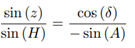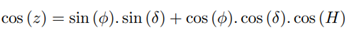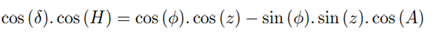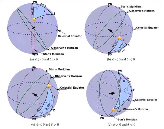 Consider point M the star, point P the south celestial pole and point Z the zenith, as shown in Figure 13. It is known that z is the zenith distance, A is the azimuth and H is the hourly angle of the star.