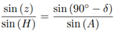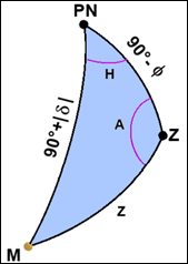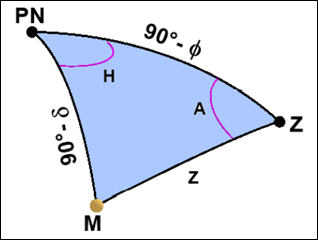 Consider point M the star, point P the north celestial pole and point Z the zenith, as shown in Figure 14. It is known that z is the zenith distance, A is the azimuth and H is the hourly angle of the star.