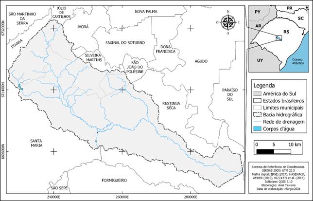 A sub-bacia hidrográfica do rio Vacacaí-Mirim se localiza na região central do estado do Rio Grande do Sul (Figura 1), situada entre as longitudes 226.752mE e 295.235mE e entre as latitudes de 6.685.562mN a 6.734.506mN, com coordenadas referenciadas no datum horizontal SIRGAS-2000, projetadas no Sistema Universal Transversa de Mercator (UTM), Fuso 22, zona J, pertencendo à região hidrográfica do Guaíba.