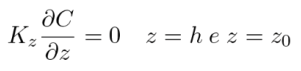 Em que C(x,y,z) representa a função da concentração (Kg/m3), o coeficiente de difusão é dado por Kz(m2/s) na direção vertical do transporte turbulento, u é a velocidade média na direção longitudinal e v na direção transversal.