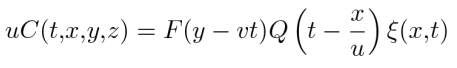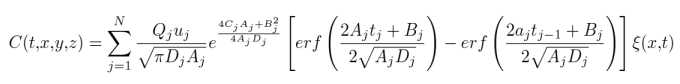 Para obter a solução da equação de dispersão tridimensional transiente, foi usada a combinação da técnica de separação de variáveis e a técnica GILTT (Generalized Integral Laplace Transform Technique). Maiores informações podem ser encontradas em Gonçalves et al. (2018). Consequentemente, a concentração C é dada pela seguinte equação: