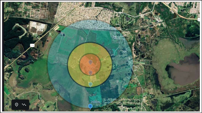 Figura 1 – Ilustração das áreas afetadas em raios de 500m, 1000m e 2000m