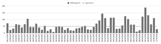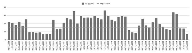 The evaluated parameters were compared with world legislation. For CO pollutant, the WHO legislation does not stipulate daily limits. For this reason, it was used the Institute of Energy and Environment (IEE) of 2012, in which several countries were identified that adopt daily standards, the most restrictive value being 8000 μg/m³ (8 mg/m³) in 24 hours. For the O3 pollutant, the IEE (2012) was also used, with the maximum desirable value being 30 μg/m³ in 24 hours. For the NO2 pollutant, the IEE (2012) standards were used, with the most restrictive value being 80μg/m³ in 24 hours. PM10 was compared with the legislation of the World Health Organization (WHO) of 2005, where the legislation foresees desirable values of up to 50μg/m³, as well as PM2.5 with concentrations up to 25μg/m³ (IEMA, 2012; WHO, 2005).