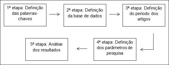 Trata-se de uma pesquisa de abordagem qualitativa-quantitativa, de abordagem multidisciplinar (JAPIASSÚ, 1976; SILVA; HAINARD, 2005), cuja coleta de dados envolve tanto de informações numéricas como de informações de textos narrativos ou analíticos, tal como ensina Gil (2017). Sendo assim, foi desenhado o fluxograma dos procedimentos metodológicos, conforme indicado na Figura 1. Nela, estruturam-se, o ordenamento sequencial, em cinco etapas, que buscam relacionar as três palavras chaves a serem varridas nas bases de dados e, posteriormente, já citadas.