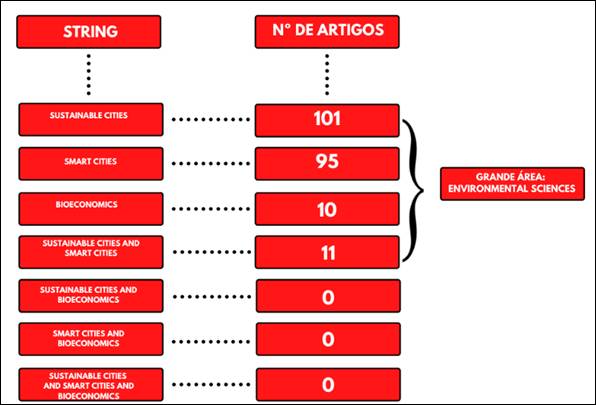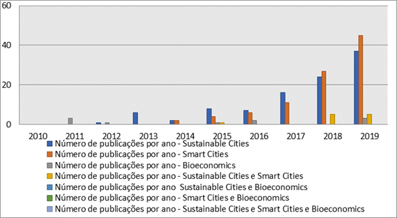 Por conta dos procedimentos e dos tratamentos de dados coletados permitiram considerar que o termo “Sustainable Cities” foi o que obteve o maior número de artigos, sendo 101 no total. Em segundo lugar, o termo “Smart Cities” obteve 95 artigos encontrados. Logo após, “Bioeconomics” obteve 10 artigos encontrados. A única combinação de termos que obteve resultados foi o termo Sustainable Cities com Smart Cities, se tratando da ligação entre os três termos, com 11 artigos encontrados. Os outros termos, relacionados à Bioeconomia, chamados de Bioeconomics, não foram encontrados e relacionados com Smart Cities ou Sustainable Cities.