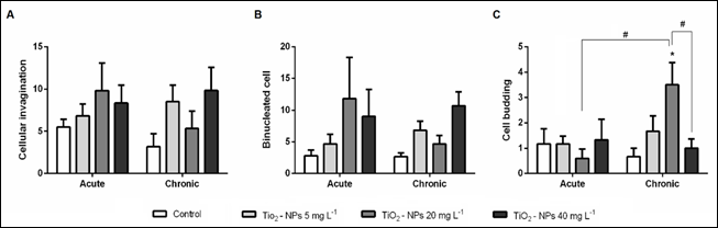Regarding the micronucleus test (Table 3), there was no significant difference among groups (p = 0.967) in the acute exposure. However, the animals exposed to 20 mg L-1 of TiO2-NPs differed significantly from the control group (p = 0.046) in the chronic exposure. In the other groups, no significant differences were observed for the micronucleus counting (p > 0.05). There were also no significant differences between both exposures (acute and chronic) for the groups exposed to 5.0 mg L-1 (p = 0.242), 20 mg L-1 (p = 0.145) and 40 mg L-1 (p = 0.242) of TiO2-NPs.