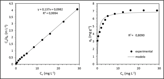 The Langmuir isotherm obtained by the linear method for the Pb element can be observed in its graphic form (Figure 2) as a straight line that starts from the origin, corresponding to the trend line of the results obtained in the laboratory. This indicates that the amount adsorbed by AC is proportional to the concentration of the solution, with Ce/qe (g L^(-1) being the mass of adsorbent (AC) per liter of solution (water plus Pb) not showing its maximum capacity for adsorption. On the other hand, the non-linear method the curve was obtained and reveals an extremely favorable capacity for the adsorption of Pb by CA when using the pre-established experimental conditions, with the maximum removal achieved being 6.98 mg. g–1.
