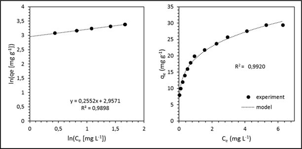 Figure 5 – Linear (left) and non-linear (right) Freundlich isotherm for Cd adsorption by activated carbono