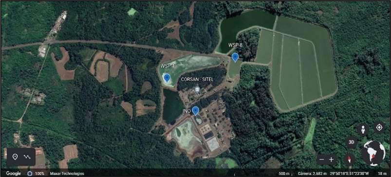 Figure 4 – Effluent collection sites tested at the WWTP: inorganic (INO), waste stabilization pond 1 (WSP-1) and waste stabilization pond 8 (WSP-8)