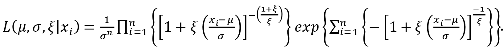 A maximização da Equação (3) com respeito ao vetor de parâmetros () permite obter o estimador de máxima verossimilhança para a distribuição GEV. Embora não exista uma solução analítica para esta maximização, o processo é viável para qualquer conjunto de dados específico por meio do uso de algoritmos padrão de otimização numérica.