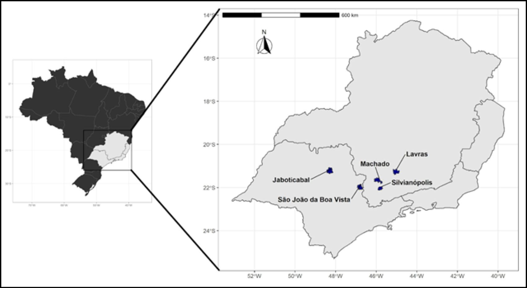 Figura 1 – Localização das cidades de Jaboticabal-SP, São João da Boa Vista-SP, Machado-MG, Silvianópolis-MG e Lavras-MG