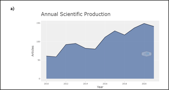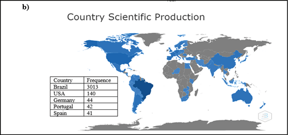 Figure 1 – a) Annual global scientific production; b) Scientific production by country; c) Universities that publish the most on the subject of this review; d) Word Cloud with the 100 most cited words in the abstracts of the analyzed articles