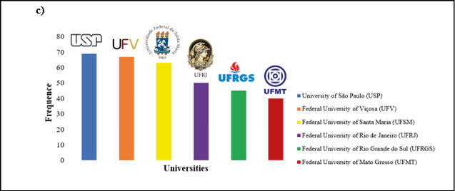 According to the bibliometric analysis carried out, it is noted that there is a growing interest in the topic of pesticides in Brazil, with a sharp growth from 2015 and the highest peak of publication in 2020 and an annual growth rate of 7.91% (Figure 1a). As expected, Brazil is the country that publishes the most articles on the topic, followed by the USA, Germany, Portugal, and Spain, which suggests research partnerships between these countries and Brazil (Figure 1b). Also, according to Figure 1c, the pioneer universities in publications on the topic addressed in this review are: the University of São Paulo (USP), Federal University of Viçosa (UFV), Federal University of Santa Maria (UFSM), Federal University of Rio de Janeiro (UFRJ), Federal University of Rio Grande do Sul (UFRGS) and Federal University of Mato Grosso (UFMT), showing that the educational institutions that most study the presence of pesticides in the environment and food are concentrated mainly in southern and southeastern Brazil.