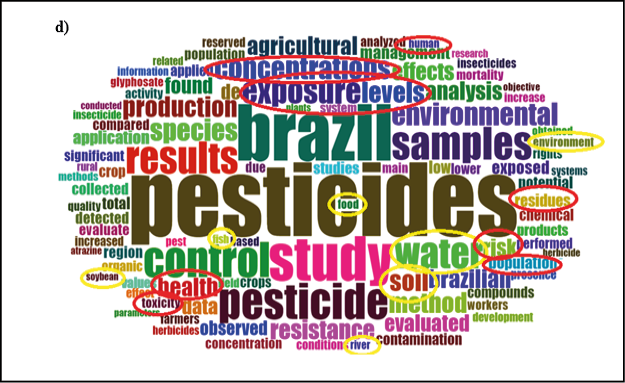 In the word cloud generated with the 100 most cited words in the abstracts of the articles (Figure 1d), the words circled in yellow (“environment”, “soil”, “water”, “river”, “fish”, “food” and “soybean”) indicate the main environmental compartments that pesticides were detected in Brazil and reported in studies, also, the words circled in red (“human”, “concentrations”, “residue”, “exposure”, “levels”, “ population”, “toxicity”, “health” and “risks”) suggest carrying out studies that address the risks of exposure to pesticides to the health of the Brazilian population.