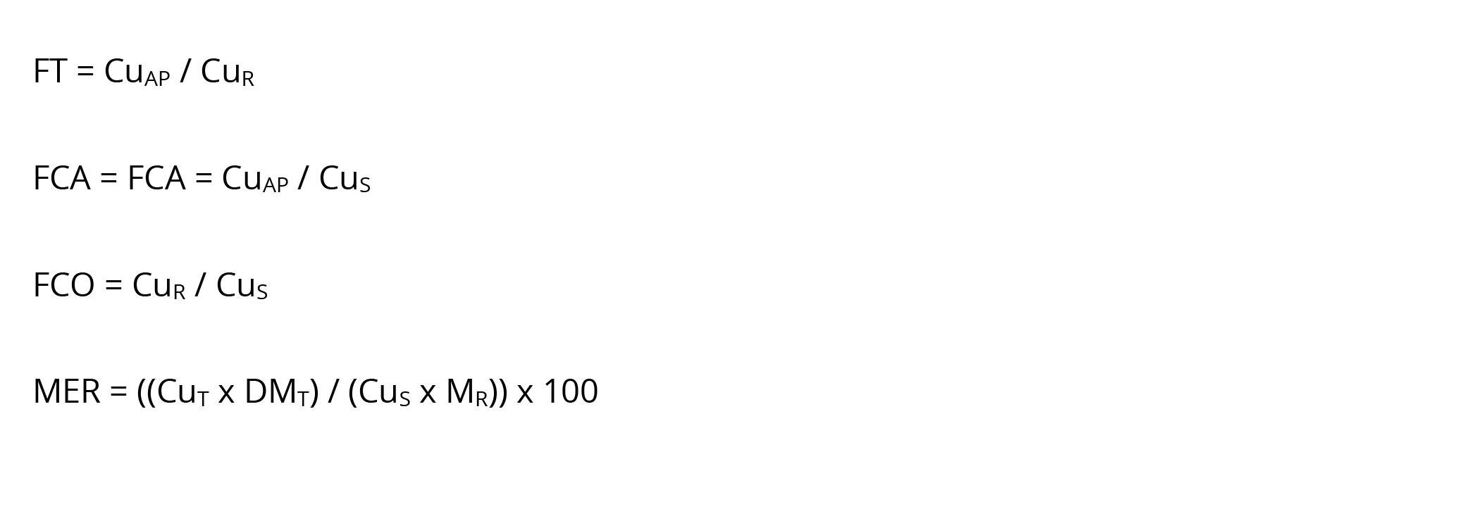 where: CuAP = Cu concentration in aerial part dry mass; CuR = Cu concentration in root dry mass; CuT = Cu concentration in the total dry mass; CuS = Cu content available in the soil after cultivation; DMT = total dry mass; e MR = mass of soil volume rooted by species.