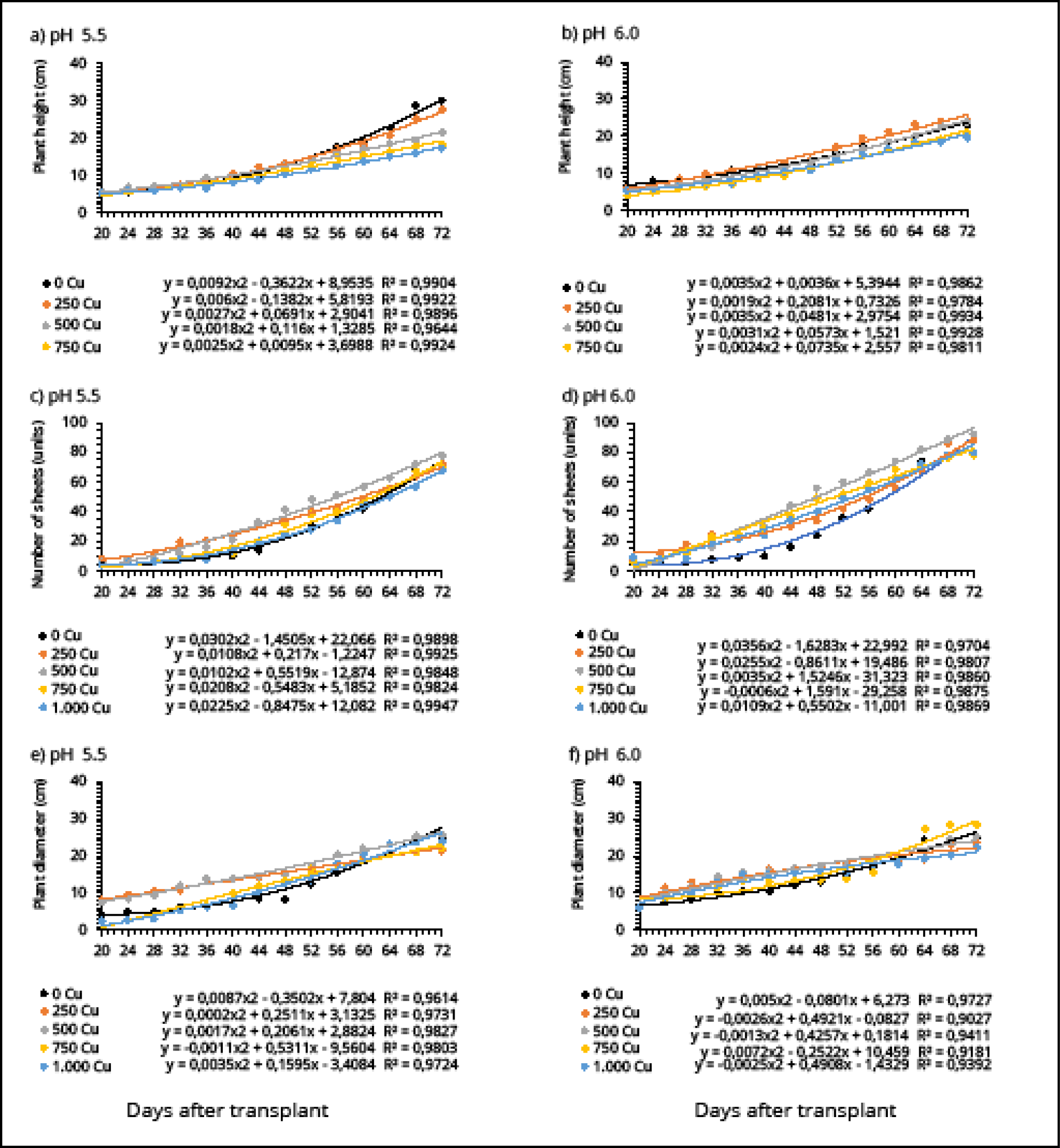 Regarding the number of leaves (Figures 1c and 1d), there was similarity between Cu concentrations for both pH corrections. From 44 DAT approximately, the amount of leaves increased, mainly in the intermediate treatments with contents of 250; 500 and 750 mg kg-1 of Cu. It can be assumed that this effect is a possible adaptation of the plant, since at the content of 1,000 mg kg-1 of Cu added to the soil there was an increase in the number of leaves from 60 DAT onwards.