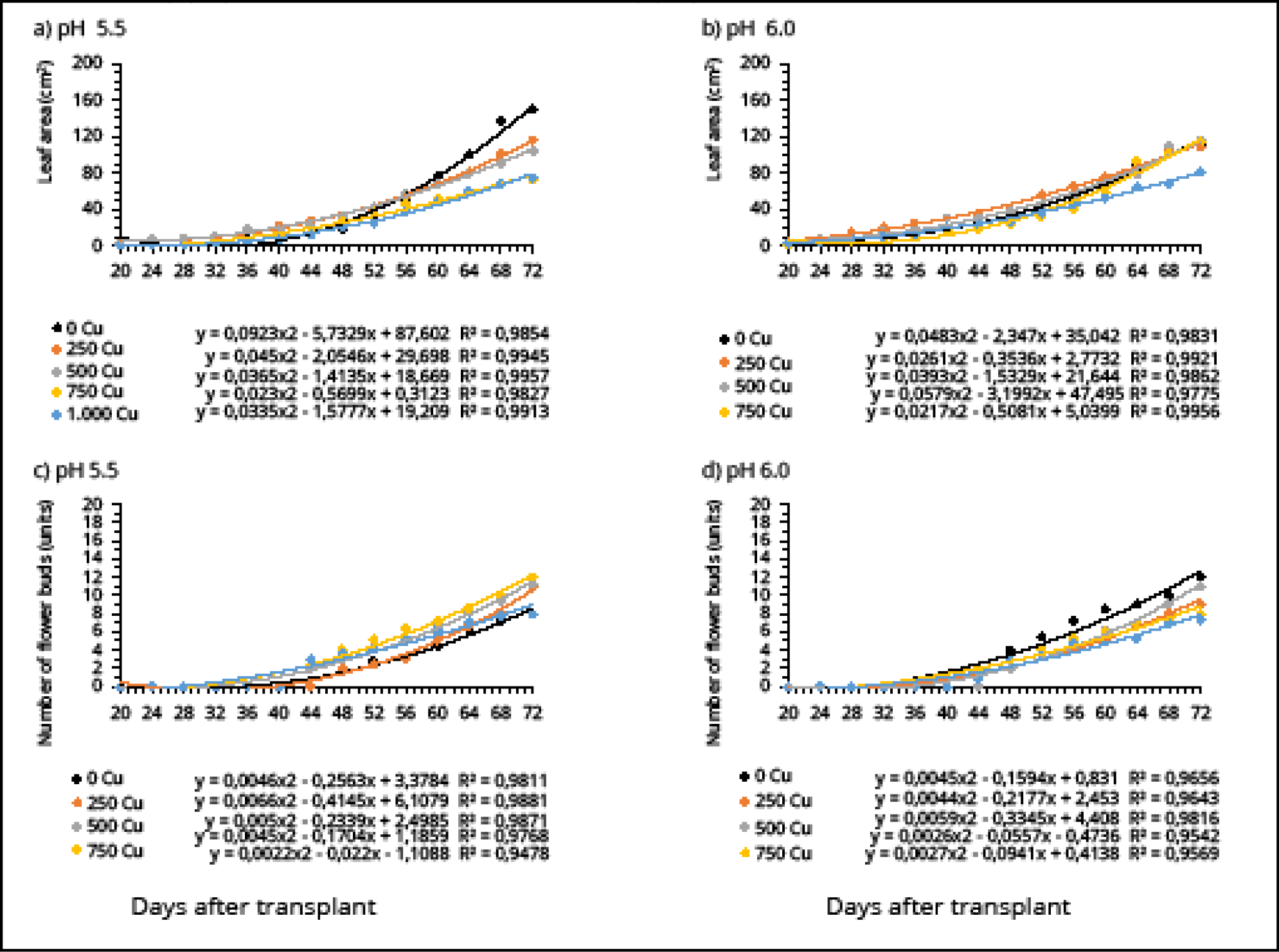 The development of flower buds (Figures 3c and 3d) occurred from 44 DAT onwards in soil correction at pH 5.5. It was observed that plants with treatments of 500 and 750 mg kg-1 of Cu developed a greater number of floral buds when compared to the treatment without addition of Cu. For soil correction at pH 6.0, the highest number of flower buds occurred in the treatment without adding Cu, which may be explained by the low availability of Cu and pH close to the ideal standards for the cultivation of this crop.